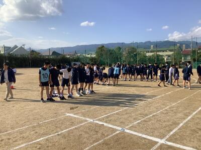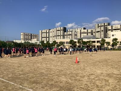 スポーツ大会の生徒会種目「9人10脚リレー」の練習が行われました。この競技は異学年混合の4チームで競い合うもので、チームワークが勝負の鍵となります。練習前には、各チームの3年生が考えた応援を全員で元気よく披露し、チームの士気を高めました。その後、息を合わせて走る練習に取り組み、笑顔と真剣な表情が入り混じる充実した時間となりました。その後、クラス対抗の「リレー大縄」の練習も行いました。体育大会に向けての熱気が高まっています。本番に向けて、放課後の練習はこれからも続きます。