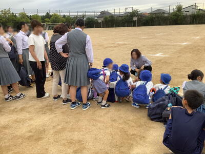 放課後、生徒向けに吹奏楽部によるマーチング演技がグラウンドで披露されました。今回の演技は、夏休みに行われたマーチングコンテスト県大会で金賞を受賞したプログラムで、迫力ある演奏と息の合った隊列に、会場は大きな歓声がおこりました。この日は潮見幼稚園の園児も見学に訪れ、色鮮やかなユニフォームや力強い演奏に目を輝かせていました。曲の展開に合わせて変化するフォーメーションや、部員たちの真剣な表情が印象的で、演奏後には大きな拍手が送られました。吹奏楽部の努力と成果を称える、心温まるひとときとなりました。
