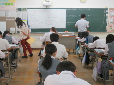同じ式が何度か出てくる問題を、その式を1つの文字で表して、見やすく因数分解しようとしています。ずいぶん難しい問題ですが、みんな熱心に解いています。