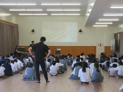 6時間目、1年生は明日の校外学習の出発式を行いました。