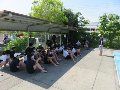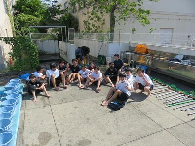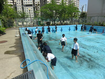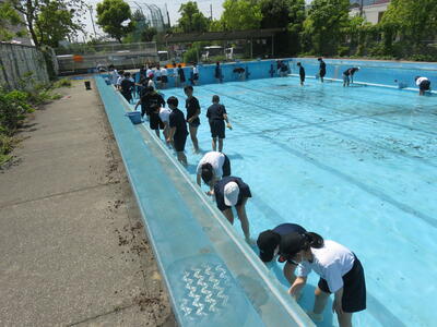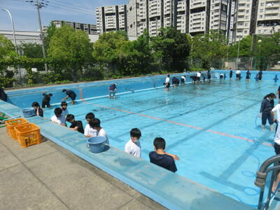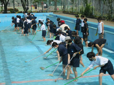 午後、1年生のボランティアがプール掃除をしてくれました。