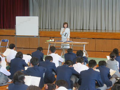 2年生は、講師として「結いの会」の 阪上邦子様 にお越しいただき、「トライやる・ウィーク」に向けてのマナー講座を行いました。