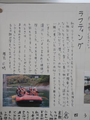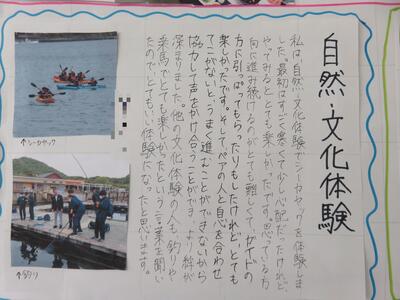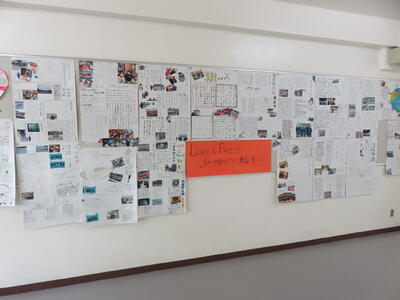 〈3年生廊下〉修学旅行を振り返って班ごとに新聞を作りました。