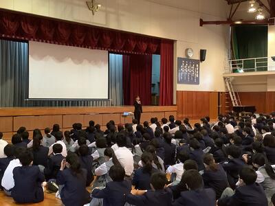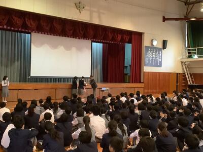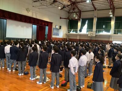 全校朝礼での校歌斉唱 コロナ前は当たり前に歌っていましたが、久々に体育館に全校生徒の校歌が響きました。月曜の朝でいきなりでしたが皆頑張って歌っていましたね。