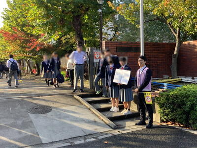 市長とともに朝の挨拶運動 投稿: ルーム管理者 (08:45) 11月10日(月)、生徒会が毎朝行っている挨拶運動に、l月に1回のペースで来ていただいている愛護委員さんに加えて高島市長が来校されました。市長は登校する生徒一人ひとりに笑顔で声をかけられ、元気な挨拶が交わされる様子に目を細めておられました。生徒たちも市長の参加に驚きながらも、明るく挨拶を交わしていました。地域と学校が連携し、挨拶を通じて温かい雰囲気を育む貴重な機会となりました。