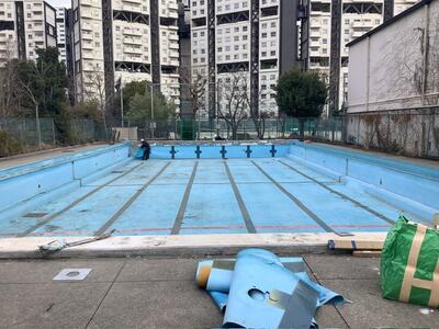 プールの工事が始まりました 投稿: ルーム管理者 (14:10) 老朽化が進んでいたプールの安全性と快適性を高めるため、本日よりプール槽シートの張り直し工事が始まりました。長年使用してきたシートは劣化が見られ、授業で安心して利用できる環境を整える必要がありました。現在は既存シートの撤去作業が進められており、その後、新しい防水シートを丁寧に張り直す工程へと移っていきます。工期は約10日間を予定しています。