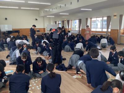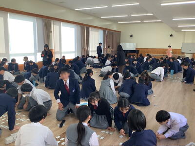 1年生カルタ大会 投稿: ルーム管理者 (13:55) 1年生は国語の学習の一環として、学年でカルタ大会を実施しました。授業で学んできた百人一首に親しみながら、日本の伝統文化に触れる機会として企画されたものです。当日は班対抗で競技を行い、読み札が響くたびに、生徒たちは真剣な表情で札に手を伸ばしていました。 大会が行われたランチルームでは、札を取れた瞬間の歓声や、惜しくも取れなかったときの悔しそうな声が広がり、終始にぎやかな雰囲気でした。