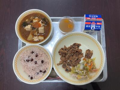 3年生 中学校最後の給食メニュー 投稿: ルーム管理者 (13:29) 3年生にとって中学校生活最後の給食は、門出を祝う特別な献立でした。お祝いの赤飯に、香ばしく揚がった鯨のこはく揚げ、爽やかな香りの白ねぎのゆずからし和え。赤だしと桃ゼリー。給食が中学校での思い出の一つになってほしいと、調理員さんが心を込めて作ってくださいました。3年間をともに過ごした仲間と囲む最後の給食は、笑顔と感謝に満ちた温かな時間となりました。