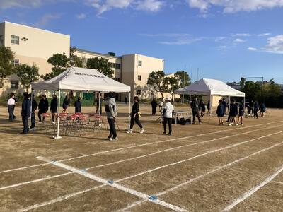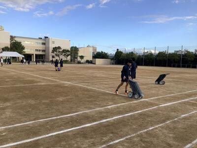 明日のスポーツ大会本番に向けて、放課後には各係の生徒たちが準備に取り組みました。グラウンドではテントを張り、ラインを引きました。生徒たちの真剣な表情からは、明日の大会を成功させたいという思いが伝わってきます。みんなの力で作り上げるスポーツ大会、どうぞご期待ください。