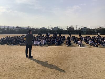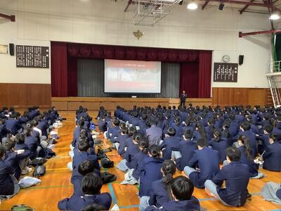 全校朝礼が行われ、校長講話では「麦踏」の話を通して、今大変だと感じることも皆さんの成長につながっているという話がありました。続いて生活担当の先生から、①挨拶を大切にすること、②時間を守る姿勢を身に付けること、③下校時の安全に気を配ることについてお話があり、日々の生活を再度見直す機会となりました。また、未来探Qコンテストの表彰伝達も行われ、受賞者には大きな拍手が送られました。全校で学びと励ましを共有する朝礼となりました。
